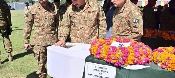 سپاہی تیمور شہید (عمر 32، ساکن ضلع لیہ)، سپاہی نادر صغیر شہید (عمر 22، ساکن ضلع باغ)، سپاہی محمد یاسین شہید (عمر 23، ساکن ضلع خوشاب)، لانس نائیک سید دانش کی نماز جنازہ۔ افکار شہید (عمر 30، ساکن ضلع پونچھ) اور نائیک اشفاق بٹ شہید (عمر 32، ساکن ضلع کہوٹہ)، جنہوں نے جنرل ایریا باغ، ضلع خیبر میں دہشت گردوں کے ساتھ شدید فائرنگ کے تبادلے کے دوران شہادت قبول کی، کو پشاور گیریژن میں سپرد خاک کیا گیا۔ آج