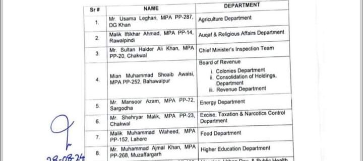 پنجاب میں پارلیمانی سیکرٹریوں کا تقرر.وزیر اعلیٰ پنجاب مریم نواز شریف نے 17 پارلیمانی سیکرٹریز کے تقرر کی منظور دے دی.اسامہ لغاری کو محکمہ زراعت , ملک افتخار احمد اوقاف و مذہبی امور کے پارلیمانی سیکرٹری مقرر.شعیب اویسی بورڈ آف ریونیو ،منصور اعظم انرجی، شہریار ملک ایکسائز اینڈ ٹیکسیشن ،ملک وحید فوڈ کے پارلیمانی سیکرٹری مقرر.اجمل خان ہائر ایجوکیشن ،سلطان باجوہ ہاؤسنگ ،سونیا عاشق انسانی حقوق ومذہبی امور ، حسن عسکری شیخ انڈسٹریز کامرس۔ انوسمنٹکے پارلیمانی سیکرٹری ہونگے.شازیہ رضوان انفارمیشن اینڈ کلچر، صاحبزادہ غزین عباسی محنت و افرادی قوت ،خالد رانجھا لا اینڈ پارلیمانی افیرز کے پارلیمانی سیکرٹری مقرر.خرم ورک لوکل گورنمنٹ کیمونٹی ڈویلپمنٹ محمد زبیر مائنز اینڈ منرل, راناطارق پلاننگ اینڈ ڈیویلپمنٹ ضیاءاللہ شاہ پنجاب ایمرجنسی سروسز کے پارلیمانی سیکرٹری بن گئے.نوشین عدنان سکول ایجوکیش،میاں شاہد حسین ایس اینڈ جی اے ڈی،ارشد جاوید وڑائچ سوشل ویلفیئر بیت المال کے پارلیمانی سیکرٹری بن گئے.