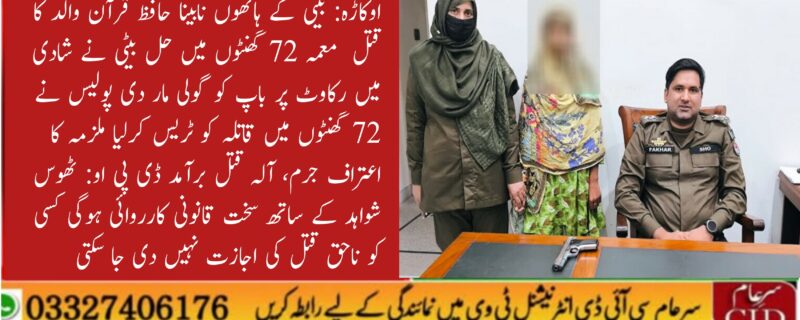 اوکاڑہ کے تھانہ صدر دیپالپور کی حدود میں نابینا حافظ قرآن کے قتل کا معمہ 72 گھنٹے میں حل کرلیا، باپ کے قتل میں بیٹی ملوث نکلی۔