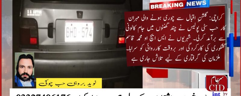 _*حب کراچی کے علاقے گلشنِ اقبال سے چوری ہونے والی کار کو حب سٹی پولیس نے چند گھنٹوں میں کارروائی کرتے ہوئے جام کالونی سے برآمد کرلیا جبکہ ملزمان موقع سے فرار ہوگئے، شام چھ بجے گلشنِ اقبال کراچی سے نامعلوم افراد مہران کار چوری کرکے اندرونِ بلوچستان لے جانے کی کوشش کررہے تھے کہ حب سٹی تھانہ کے ایس ایچ او محمد قاسم گشکوری نے ایڈیشنل ایس ایچ او عبدالوہاب رند اور ڈرائیور حنیف رونجھو کے ہمراہ فوری چھاپہ مار کارروائیاں کرتے ہوئے جام کالونی سے کار کو برآمد کرکے حب سٹی تھانہ منتقل کردیا جبکہ ملزمان کی گرفتاری کے لیے کوششیں تیز کردی گئی ہیں، حب سٹی پولیس کی بروقت اور مؤثر کارروائی پر شہریوں نے پولیس کی کارکردگی کو سراہا ہے*_