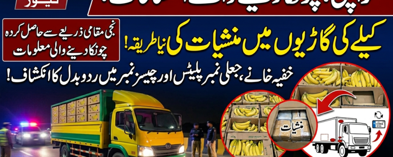 ذرائع کے مطابق اسمگلرز اب کیلے کی آڑ میں منشیات کی ترسیل کا نیا طریقہ استعمال کر رہے ہیں۔ بتایا گیا ہے کہ ان گاڑیوں میں خفیہ خانے بنائے جاتے ہیں جبکہ راستے میں نمبر پلیٹس بھی تبدیل کی جاتی ہیں تاکہ قانون نافذ کرنے والے اداروں سے بچا جا سکے۔