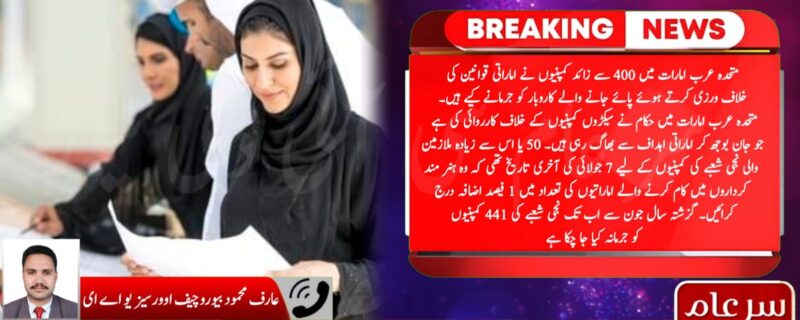 متحدہ عرب امارات میں 400 سے زائد کمپنیوں نے اماراتی قوانین کی خلاف ورزی کرتے ہوئے پائے جانے والے کاروبار کو جرمانے کیے ہیں۔ متحدہ عرب امارات میں حکام نے سیکڑوں کمپنیوں کے خلاف کارروائی کی ہے جو جان بوجھ کر اماراتی اہداف سے بھاگ رہی ہیں۔ 50 یا اس سے زیادہ ملازمین والی نجی شعبے کی کمپنیوں کے لیے 7 جولائی کی آخری تاریخ تھی کہ وہ ہنر مند کرداروں میں کام کرنے والے اماراتیوں کی تعداد میں 1 فیصد اضافہ درج کرائیں۔ گزشتہ سال جون سے اب تک نجی شعبے کی 441 کمپنیوں کو جرمانہ کیا جا چکا ہے۔