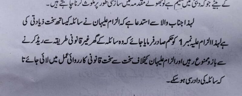 ڈی پی او قصور طارق عزیز سندھو صاحب ایک میرٹ پسند انسان ہیں آپ کے ماتحت عملہ آپکا حکم ماننے کو تیار نہیں پروین بی بی ڈی پی او قصور کو درخواست دی اور وہ مارک ہو کر سنوائی کے لیے ڈی ایس پی آفس بھیج دی گئی وہاں پر ایس ایچ او تھانہ صدر مہر شریف کا کہنا تھا کہ میں نے کوئی ریڈ نہیں کروائی جس کی فوٹیج آپ دیکھ سکتے ہیں اس کے بعد معزز عدالت عظمیٰ میں رٹ پٹیشن دائر کی گئی جس پر پروین بی بی کو دوبارہ ڈی ایس پی آفس صدر سرکل قصور میں بلایا گیا اور دوسری پارٹی کی بات سننے کے بعد بی بی کی کوئی بات نہیں سنی گئی اور ڈی ایس پی صدر سرکل قصور نے پروین بی بی کو دفتر سے باہر نکال دیا۔ڈی پی او قصور سے ڈی ایس پی صدر سرکل کا آفس عوام کا آفس ہے اپنے ماتحت عملہ کو سمجھائیں عام عوام سے کس طرح پیش آنا ہے۔یہ کہاں کا قانون ہے کہ تھانہ کے محرر فاروق کے کہنے پر مجبور خاتون کے گھر آپ بغیر وارنٹ گرفتاری اور بغیر لیڈی کانسٹیبل آپ چادر اور چار دیواری کا تقدس پامال کرتے ہوئے عورتوں کی عزت کو بھی نہ دیکھیں کل دوبارہ پروین بی بی کو سنوائی کے بغیر ڈی ایس پی صدر سرکل نے آفس سے باہر نکال دیا یہ کہاں کا قانون ہے عام عوام کے ساتھ بد سلوکی کی انتہا ہے یہ آصف وغیرہ کے پاس کوئی ثبوت نہیں ہیں اور صرف درخواست پر غیر قانونی ریڈ کروا رہے ہیں اور اعلیٰ حکام بالا نے بھی خاموشی سادھ لی ہے یاد رہے کہ چند دن پہلے ایس ایچ او مہر شریف اور محرر فاروق نے غیر قانونی طور پر ریڈ کروائی تھی جس کے بعد ایس ایچ او مہر شریف تھانہ صدر اور محرر فاروق کے خلاف رٹ پٹیشن دائر کی گئی تھی جسکی ڈی ایس پی آفس میں ہیئرنگ تھی بی بی کو سنے بغیر دفتر سے نکال دیا گیاکہ بی بی آپ نے میڈیا پر خبر لگوائی تھی جاؤ جو کرنا لو ہم لکھ کر بھیج دیں گے ۔۔